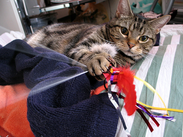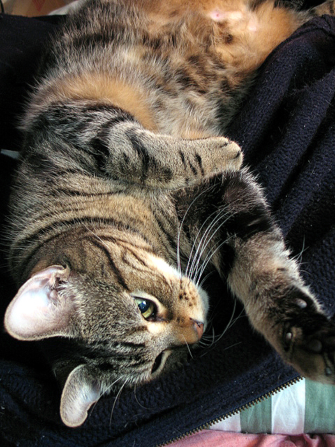 やっぱり後ろ足はアゴの下を掻こうとしてそろそろっと上がってくるが、お母ちゃんの動きが俊敏になった事を察知し、やめる。
