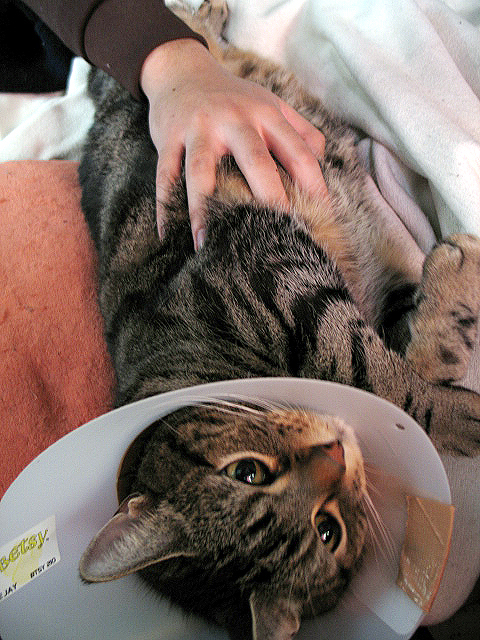 そこは獣医さん、あわてず騒がず開いた傷口に局所麻酔をかけ縫おうとしたけど、まだ完全に麻酔が効いてない状態で、ゆきちゃんが飛び上がった。
