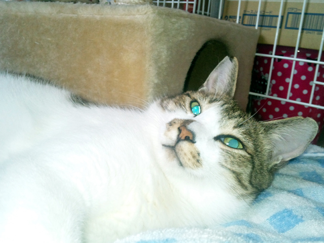 <おまけ>↓この画像はまだ春先に、やっとジュリーがケージから出て照明の下でお顔を見せてくれた瞬間を携帯で撮りました。そんなに痩せてる感じでもなかったジュリー。